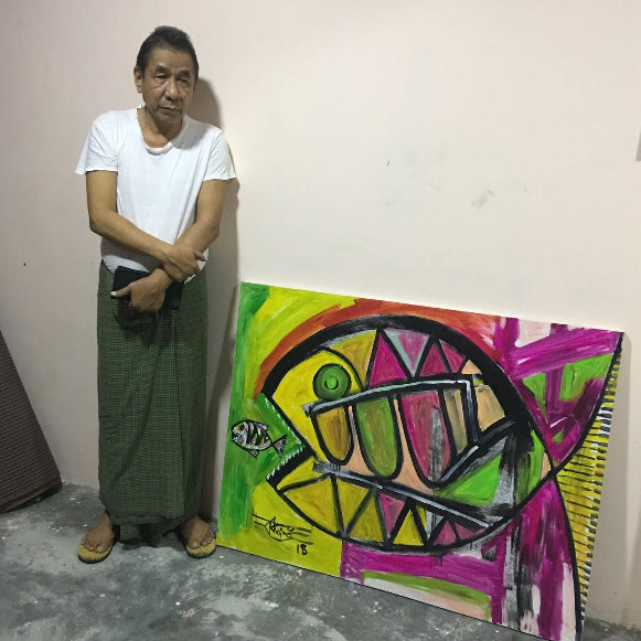 Throughout the 1970s, he participated in 26 group exhibitions and attempted a solo show in 1984, which was fully censored. Forced to rely on illustration work, he produced over 40,000 sketches while moving between ten locations. After a long absence from the art world, he reemerged in 2010 and held successful solo exhibitions in 2013 and 2014. His international breakthrough came with “Banned in Burma” (2014) and “Burma By Proxy” (2015) in Hong Kong, showcasing the resilience and evolution of his artistic journey under censorship.